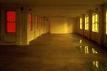 Five of the large plate glass sheets were accidentally broken in transport and thus not fitted to the windows but laid out on the floor in front of the windows with a yellow gel affixed to the existing windows.